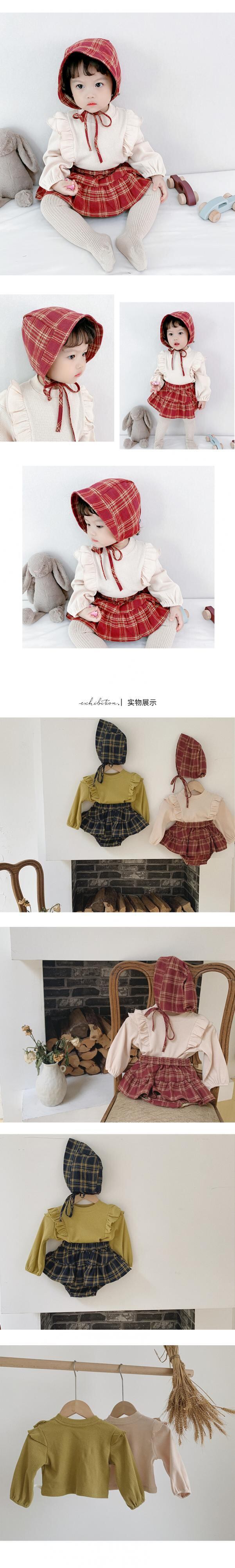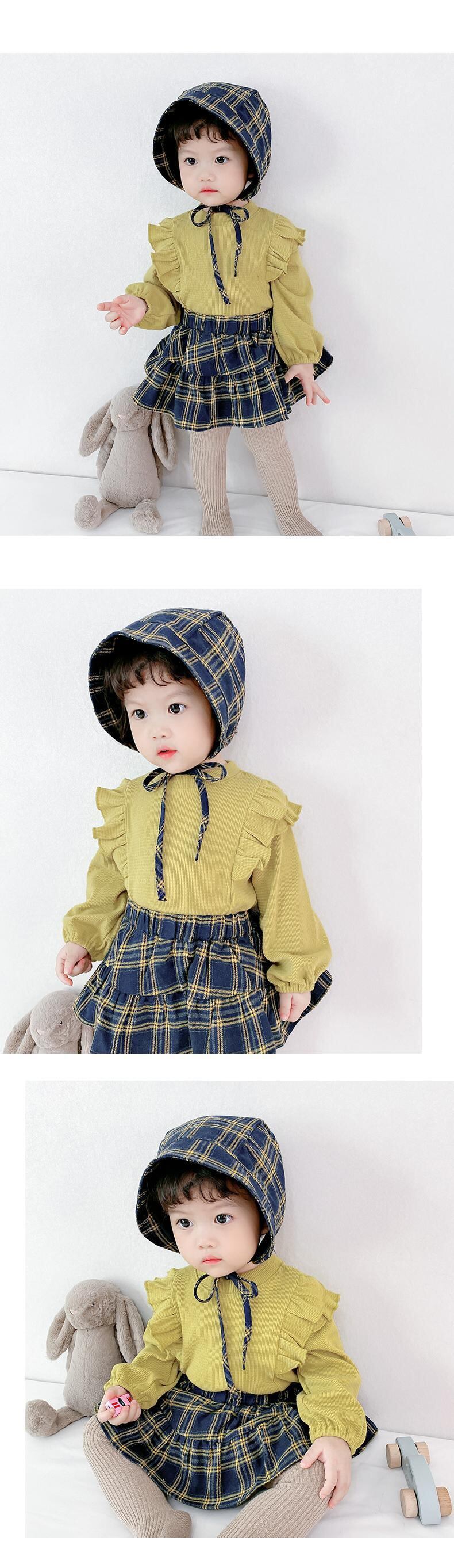 色:マスタードグリーントップ,ベージュトップ,グリーンチェック柄パンツ+帽子,赤いチェック柄パンツ+帽子,緑のブラウス+緑のズボンと帽子のセット,ベージュトップス+レッドパンツハットセット