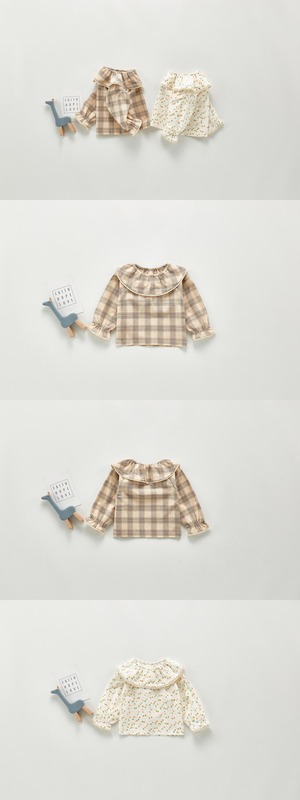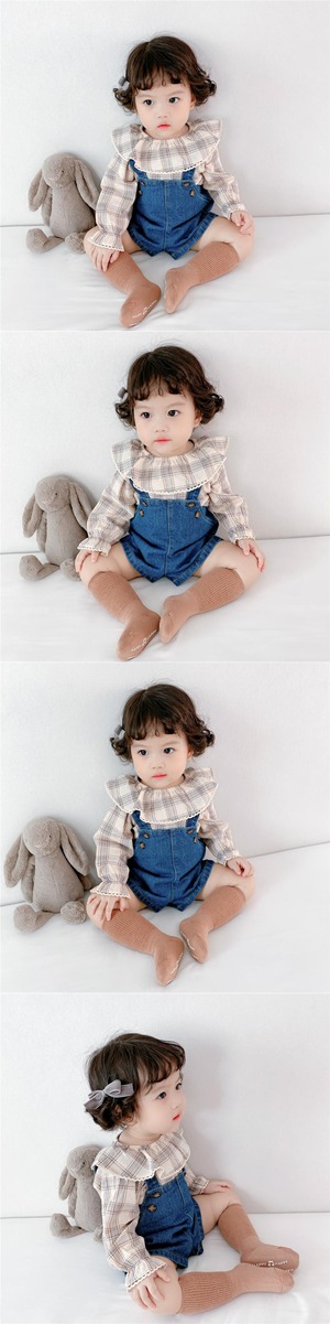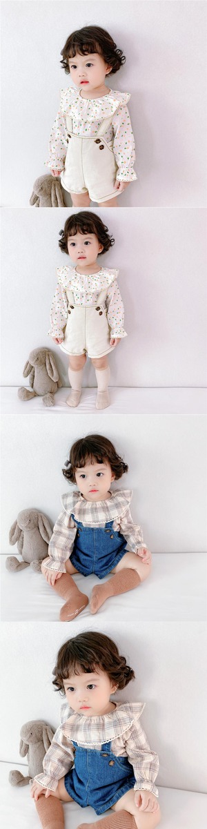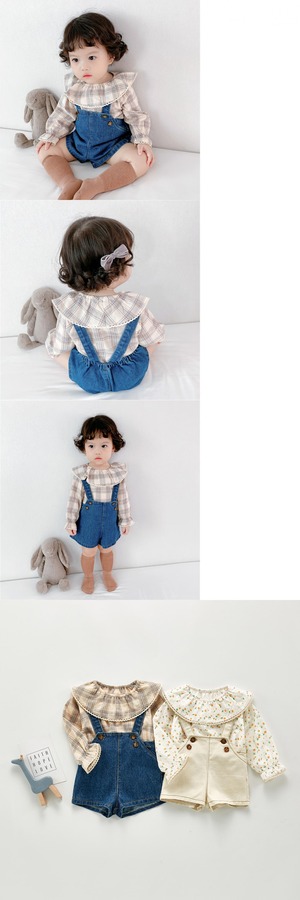 色:青いオーバーオール,白いよだれかけ,格子縞のシャツ,花柄シャツ