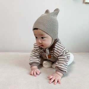 色:ライトグレーロンパース,ストライプローブ,ライトグレーのレギンス,ベージュのレギンス