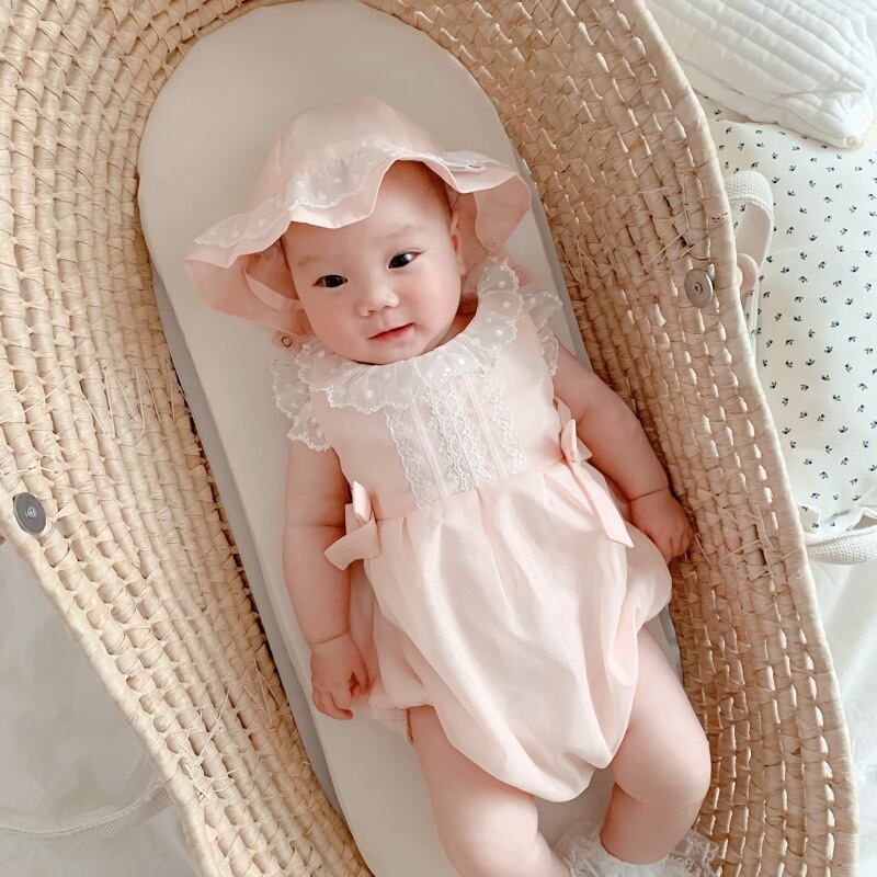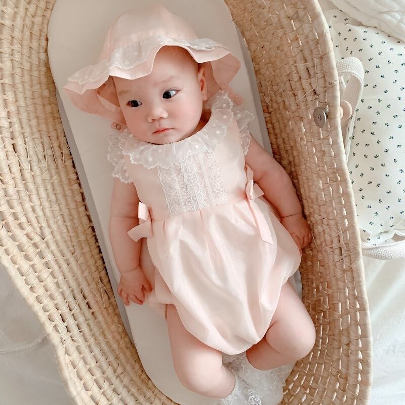 色:ピンクレースのロンパース,ピンクの帽子