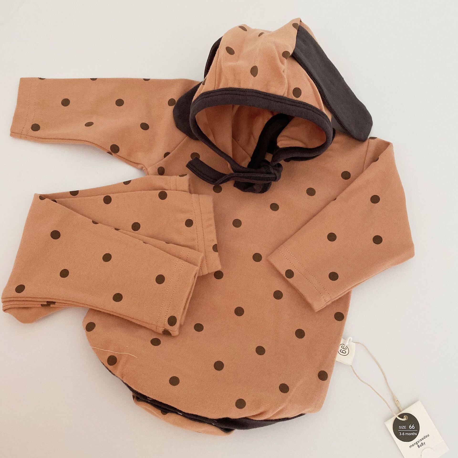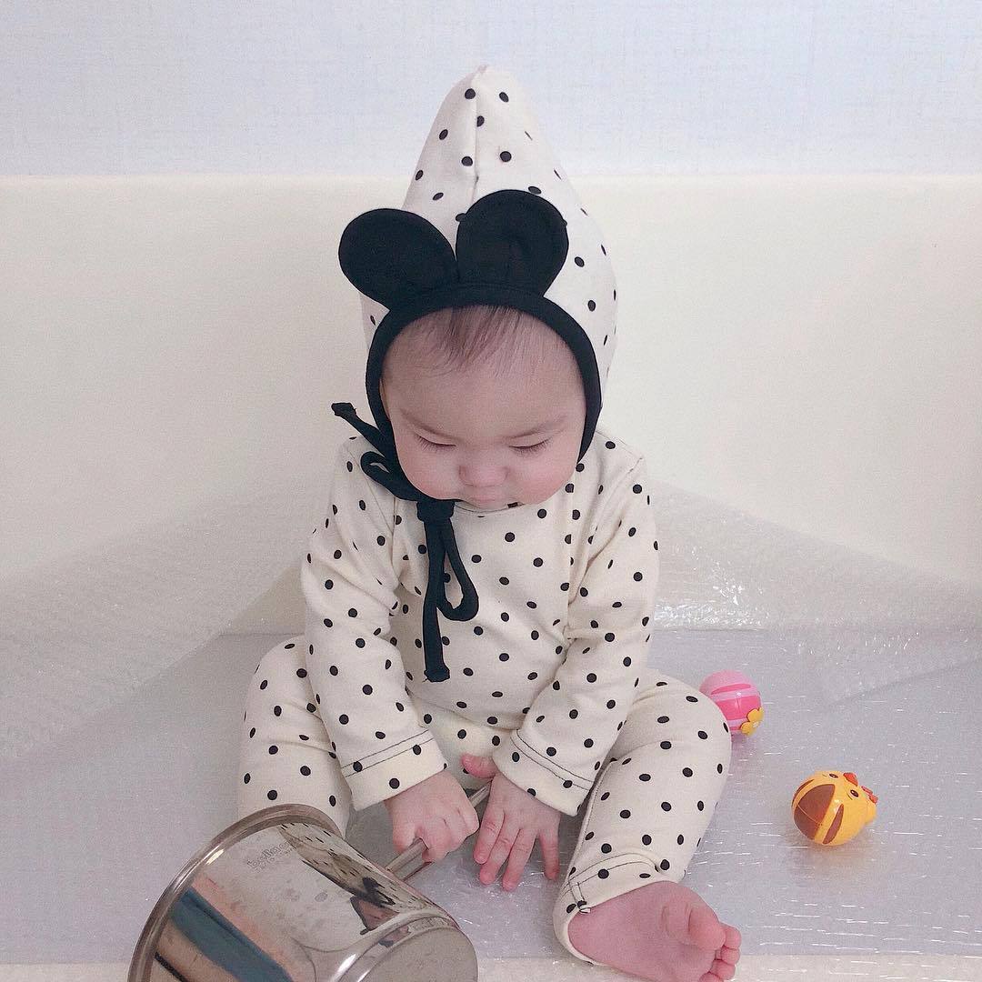 色:ホワイト水玉トップ+パンツ+帽子,オレンジ水玉ロンパース+パンツ+帽子